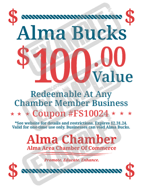 * Offer valid on purchases made before 12.31.25. To redeem in-person at checkout and is valid for one-time use only. Redeemable at any Alma Chamber Member business. Must use full amount. This offer is not redeemable for cash or gift cards, nor is it valid toward previous purchases. Offer may not be combined with any other coupons, discounts, offers, or promotions. Void if altered, copied, transferred, auctioned or sold. Offer valid on in-stock items only. No rain checks issued. Offer not valid for prior purchases. Other restrictions may apply. Cash Value none. Offer can change at any time. Restriction can change.