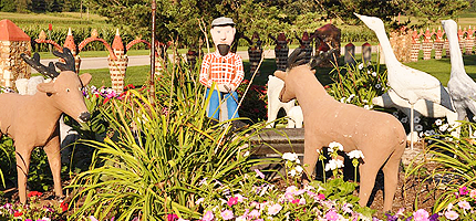 Picnic tables offer views of the sculptural display, colorful flower beds, and nearby forested bluffs. Waumandee Creek, a quiet tributary of the Mississippi, borders the property and is home to abundant wildlife.