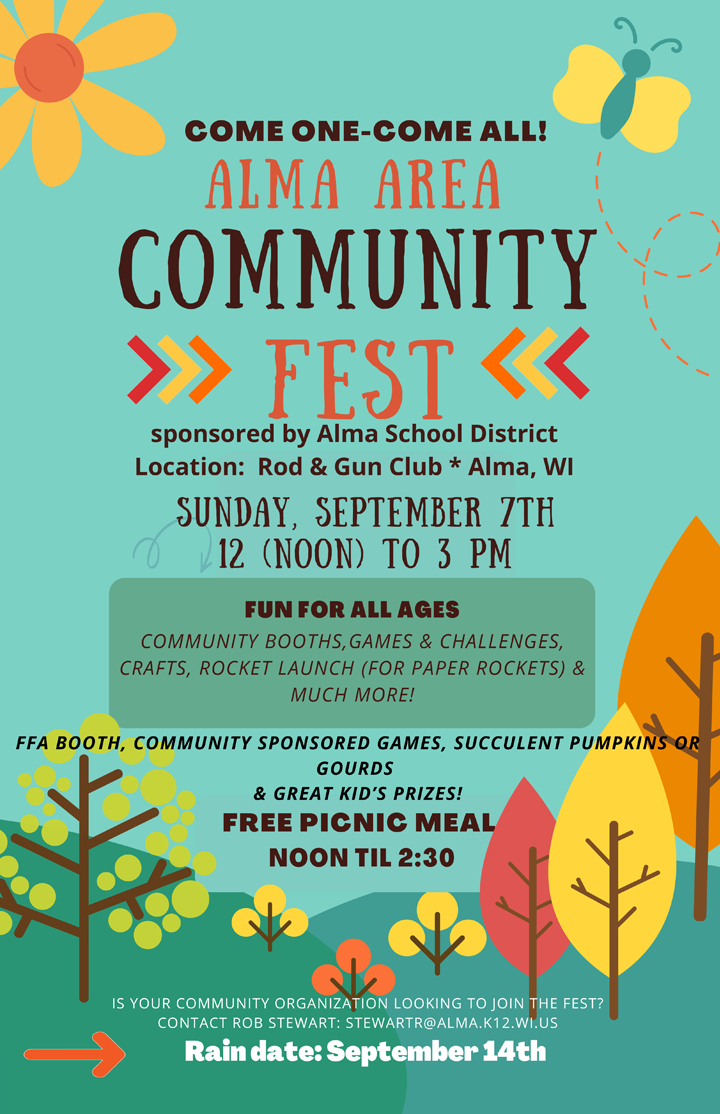 The Alma Area Community Fest will be on Sunday, September 6, 2026, located at the Rod & Gun Club in Alma, Wisconsin. There will be fun for all ages including games, challenges, prizes, crafts and rocket launch. The FREE picnic will be from Noon to 2:30pm. The event will close with a music walk and great prizes. The event is sponsors by the