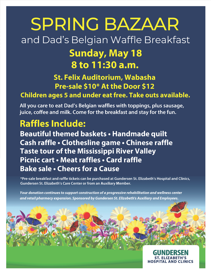 *Pre-sale breakfast and raffle tickets can be purchased at Gundersen St. Elizabeth's Hospital and Clinics, Gundersen St. Elizabeth's Care Center or from an Auxiliary Member. Your donation continues to support construction of a progressive rehabilitation and wellness center and retail pharmacy expansion. Sponsored by Gundersen St. Elizabeth's Auxiliary and Employees.